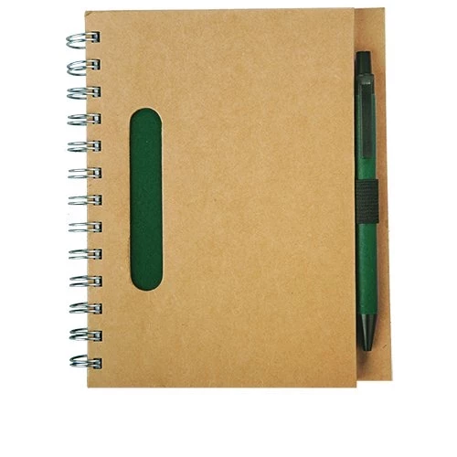 Notatnik 70 kartek formatu B6 w linie z papieru z surowców wtórnych z długopisem o wymiarach 137x10x10 mm części plastikowe są biodegradowalne.